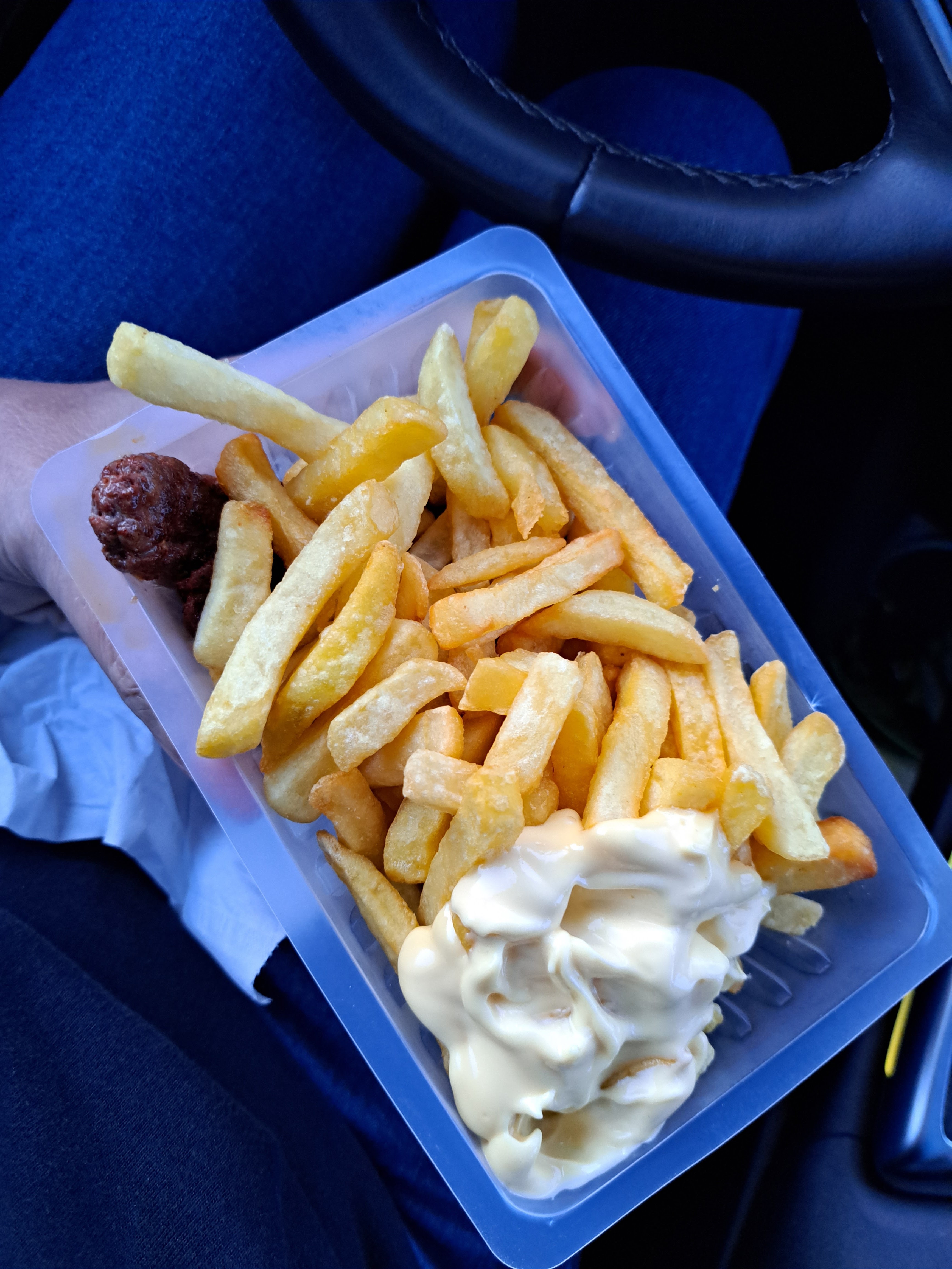 Très pratique sur la route. Service rapide malgré la queue. Un peu trop cher toutefois pour une simple barquette de frites et une knakies.